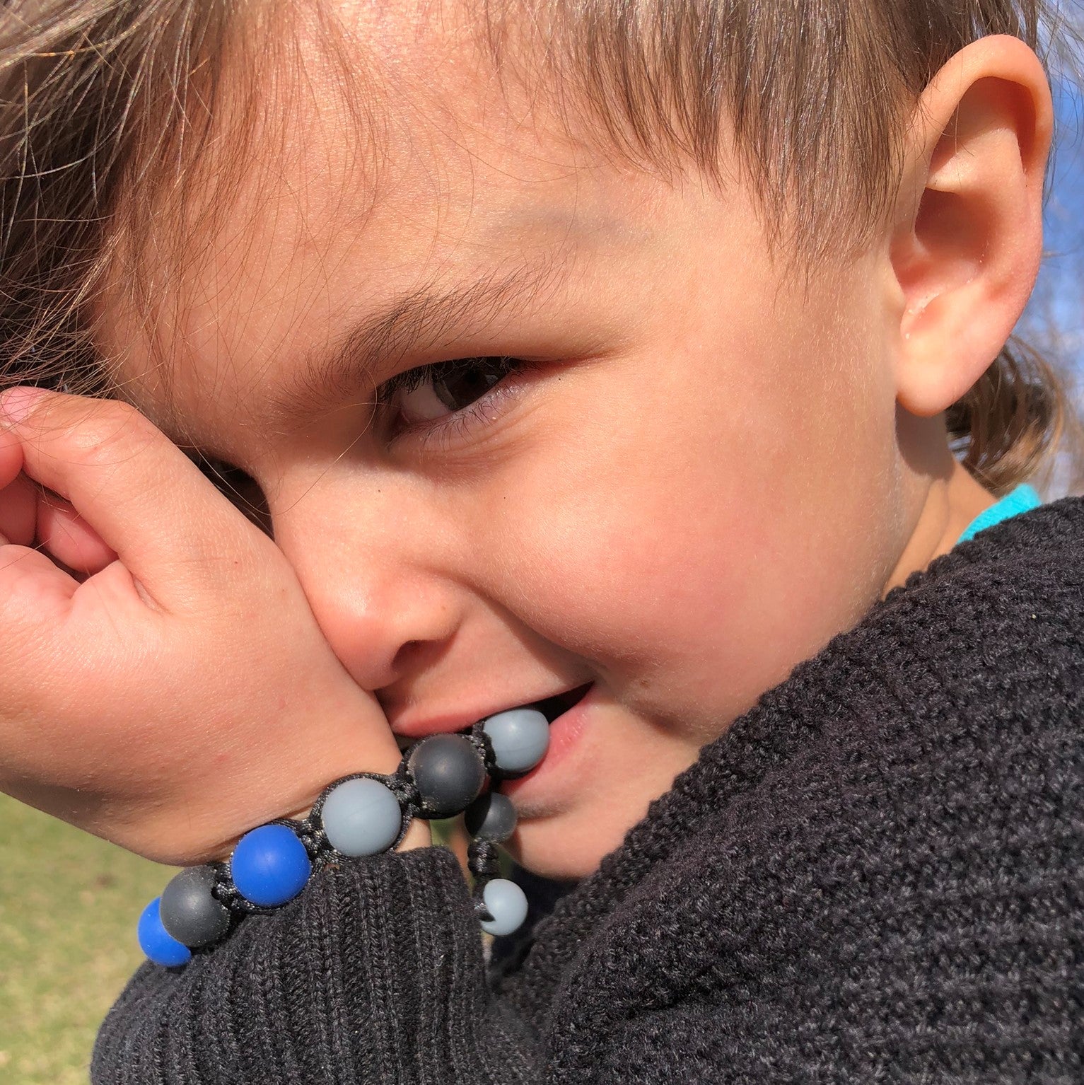 Munchables Adjustable Chew Bracelets feature smooth silicone beads strung on a nylon cord.