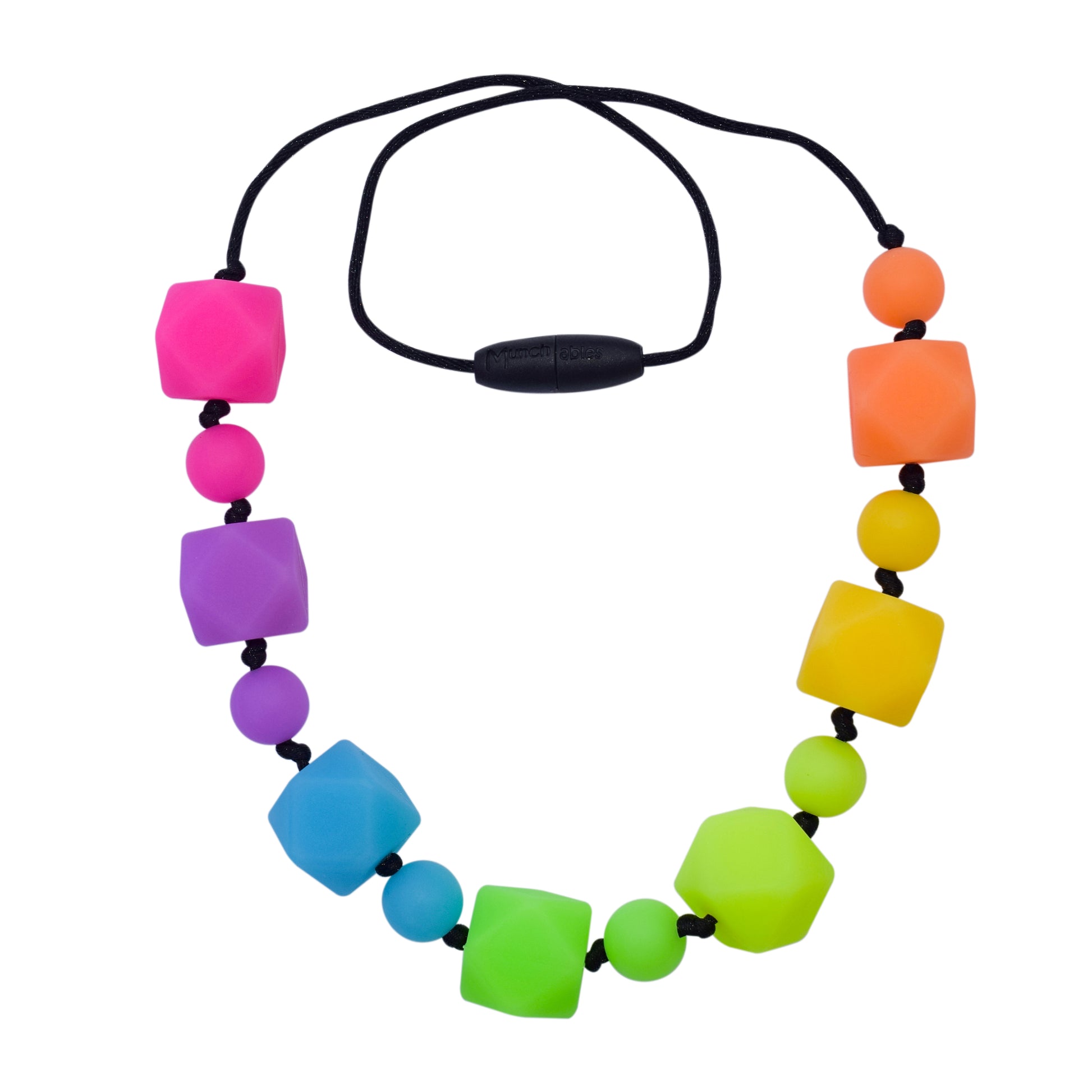 Say goodbye to chewed fingernails with this stylish beaded chewelry. The Munchables Rainbow Geo Chew Necklace features our standard smooth, round silicone beads. Beads have slightly more "squish" than pendants.